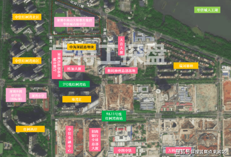 中海深超总项目位于南山区沙河街道,深湾二路与白石二道交汇处西南侧。北侧是华侨城高级中学,南侧是深铁万科臻湾汇,西面是中信红树湾,东面是TCL、神州数码等总部大厦