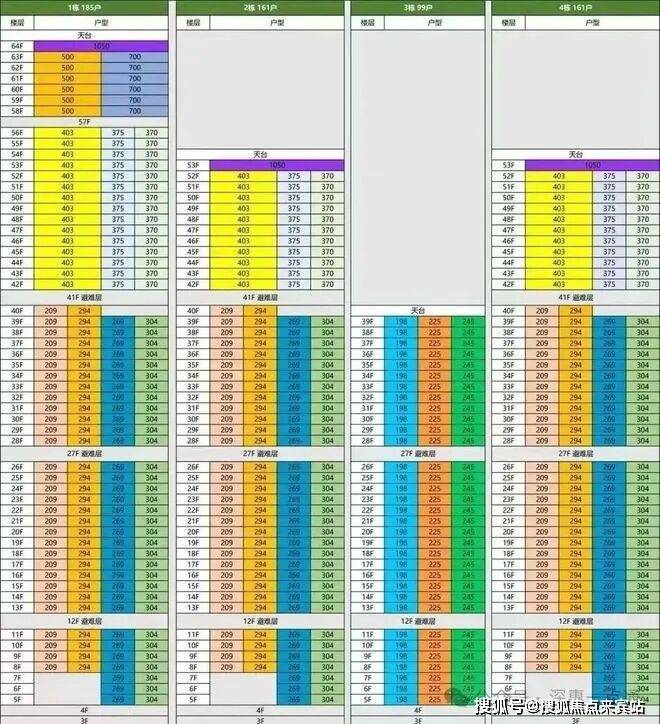 1栋公寓250米,4栋住宅分别150米、200米、200米、240米。层高3.3米,约40-70层(不含底商)