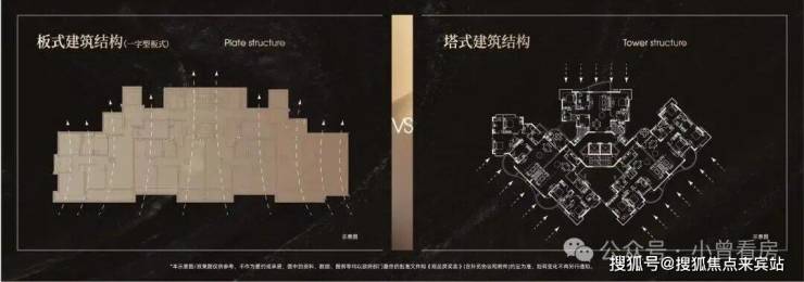 ×塔楼:混合朝向,并非户户朝南,户型间存在遮挡,容易产生对视,室内空气流线差,换气效果相对较差。