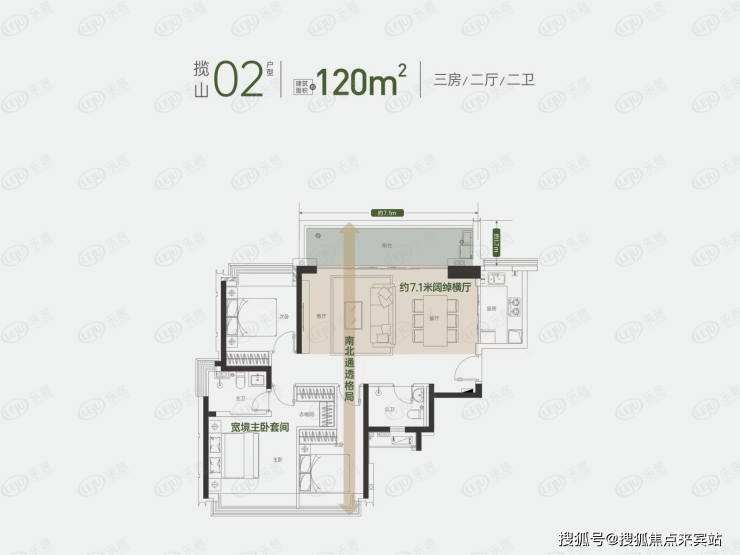 开间约7.1米,餐客厨一体化设计,进深约1.7米观景阳台,空间格局南北通透。