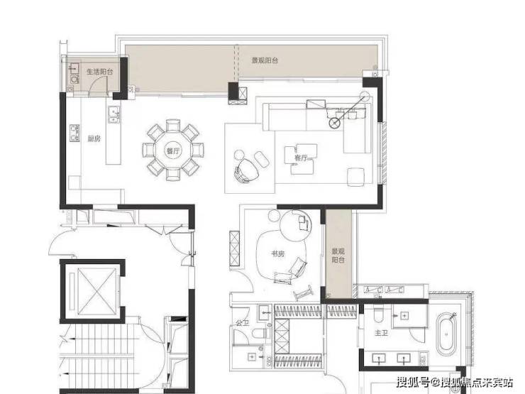 户型直接影响居住体验,较好的采光、通风、较短的归家活动动线,动静分区,都将提升居家生活体验。如下图五房四卫