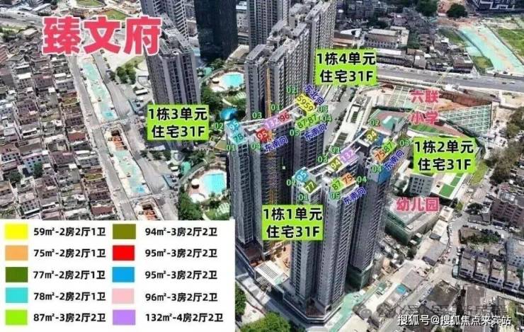 臻文府,由坪山本地房企六和集团打造,也是六和城二期,总占地面积约0.92万㎡,总建筑面积约6.85万㎡,计容建筑面积约5.32万㎡,容积率5.76,绿化率25%,共由4栋总高31层住宅组成,分别是1栋/1/2/3/4单元,另外配建1所9班制幼儿园。总规划520户,1栋1/4单元是2梯5户,1栋2/3单元是2梯4户,地下2层,停车位358个,停车位占比约1:0.69。