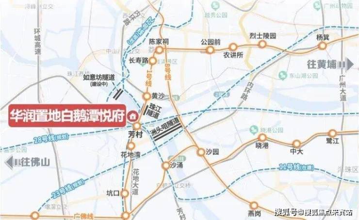 白鹅潭悦府距离地铁芳村站约400米,片区未来1号线、11/22号线(在建)、以及规划中的28号线等4条地铁交汇,业主可以直达越秀、天河、海珠,都算是非常便利。