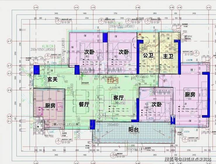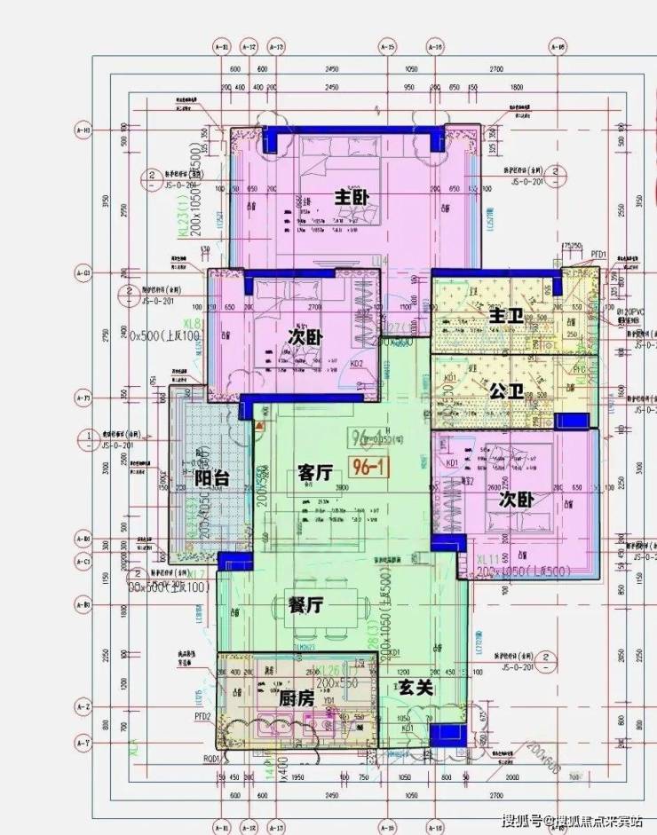 96㎡的3房2厅2卫(-1),设计的是经典竖厅格局,进门入户玄关,客厅3.7米开间,LDKB一体化,S墙设计预留冰箱卡槽位,动静分区,三开间朝南,3个卧室分别做到了主卧14.13㎡/次卧9.91㎡/次卧9.45㎡(去掉墙体,包含飘窗),U型厨房,公卫三段式分离,还带1个设备平台,东南朝向。