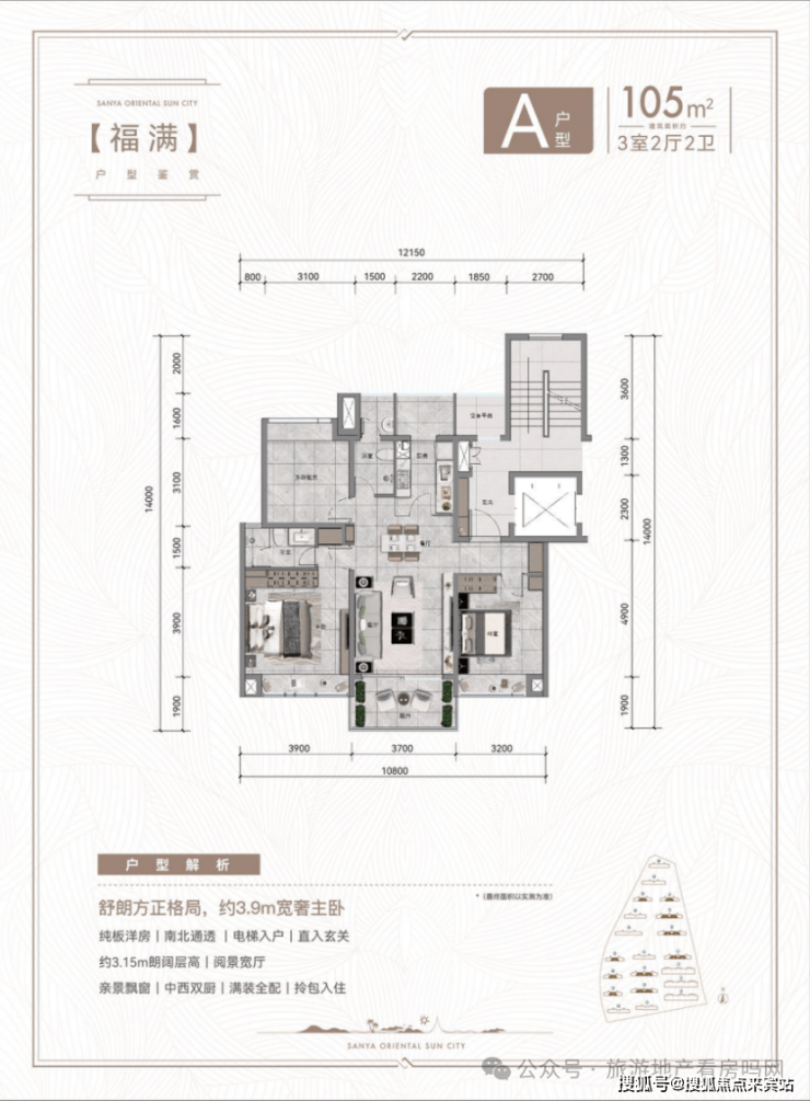 A户型:建面约105㎡,三室两厅两卫。纯板洋房,舒朗方正格局,南北通透,约3.9m宽奢主卧,约3.15m朗阔层高,阅景宽厅亲景飘窗。