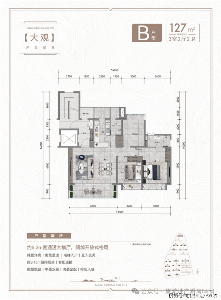 B户型:建面约127㎡,三室两厅两卫。电梯入户,直入玄关,约6.3m宽通透大横厅,阔绰开放式格局;约3.15m朗阔层高,奢配主卧瞰景飘窗。