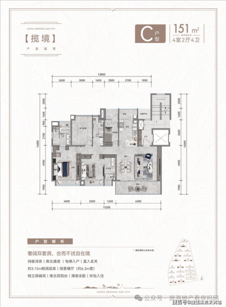 C户型:建面约151㎡,四室两厅四卫。南北通透,功能齐全;南北双阳台,奢阔双套房设计;约3.15m朗阔层高,约6.3m宽阔景横厅。