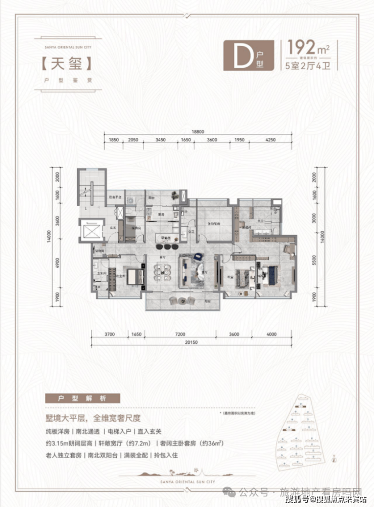 D户型:建面约192㎡,五室两厅四卫。墅境大平层,约3.15m朗阔层高;南北通透,大面积观景视野;约36m奢阔主卧套房,老人独立套房,起居便利。