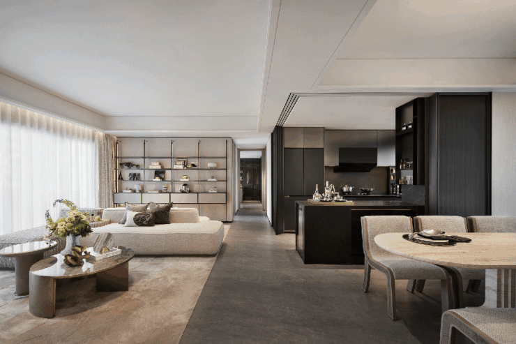 而这个“未来式”户型,绝就绝在,直接将起居区搬到了另一边,完美结合了竖厅的动静分离。做到尺度与私密兼具。