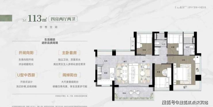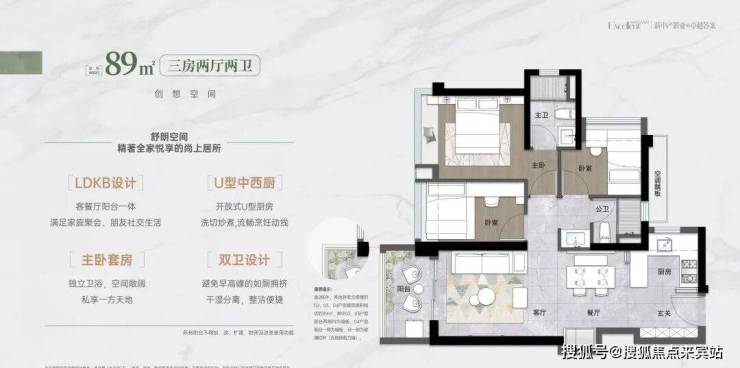 :竖厅格局、U 型厨房、双卫设计、得房率约 92%(含赠送)、西北朝向,总价约420 万起。