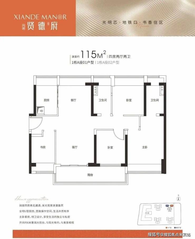 115㎡ 4房2厅2卫 竖厅南北对流、餐客分离,主次卧均带飘窗、最大化延伸居住空间,超大阳台拥有更佳的采光和景观视野。