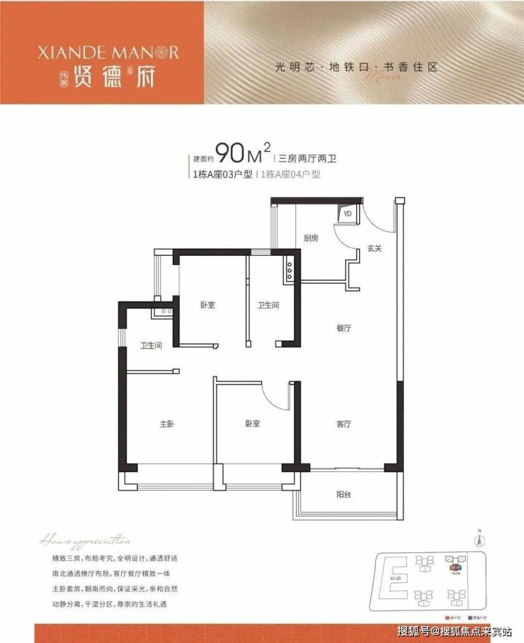 90㎡ 3房2厅2卫 传统竖厅设计 3开间朝南,客餐厅南北对流,主卧套房设计。