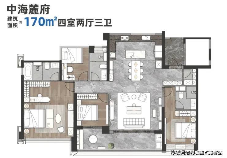 建面约170㎡的四房户型总价最高,要1200万以上。舒适度来说,它是最高的。尊梯入户,全南向四开间南北通透。两个主套空间、客厅及一个次卧,都在南向位置。客厅、次卧均与8.5米L型阔景阳台相连,观景好。