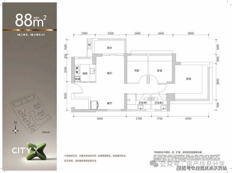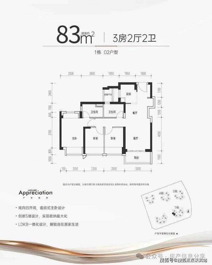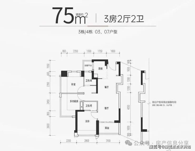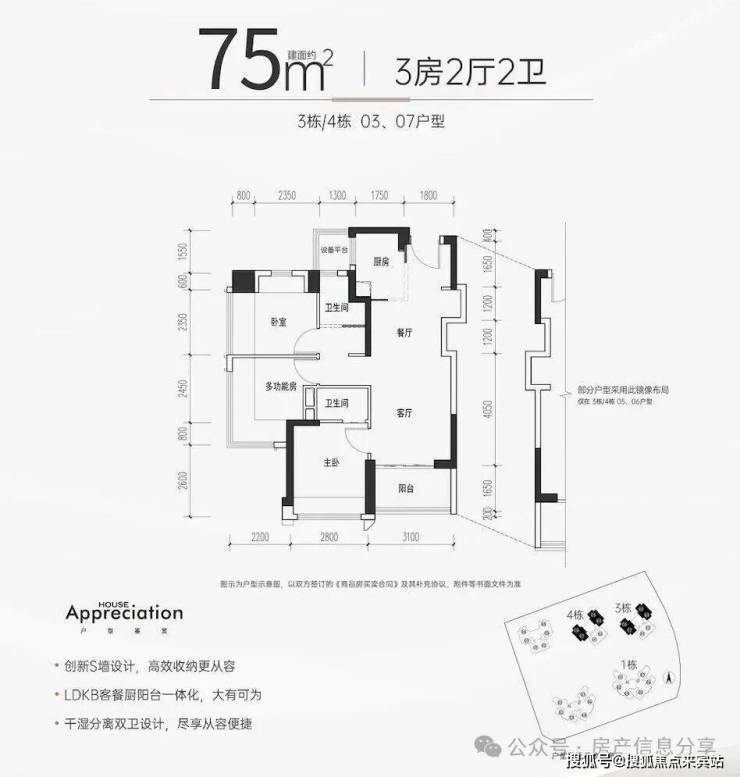 新规户型,得房率最高达104%,75平就可以做3房2卫,远优于片区其它项目,鸿荣源观城、合正观澜汇都是88平三房。