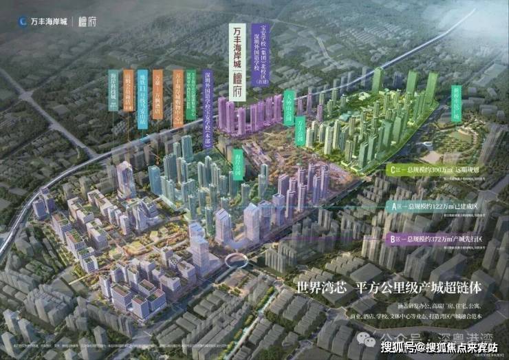 万丰区域整体城市更新项目包含A、B、C三区,合计总建面超500万平,包含商业、住宅、产业、甲级写字楼、高端酒店、学校教育、文化休闲、交通枢纽、生态公园等全维业态。