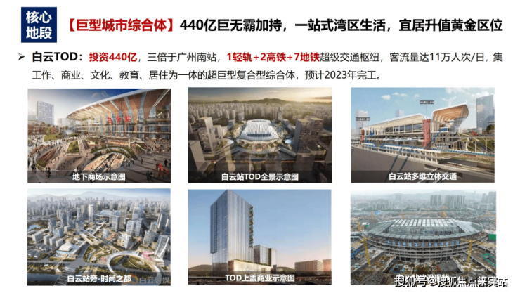 距离项目仅800m处是号称【亚洲最大火车站】的白云TOD枢纽,预计今年年底开通。这一交通枢纽未来将实现7地铁 + 1轻轨 + 2高铁的交通网络,客流量可达11万人次/日,这将为项目带来巨大的升值潜力和源源不断的人流。