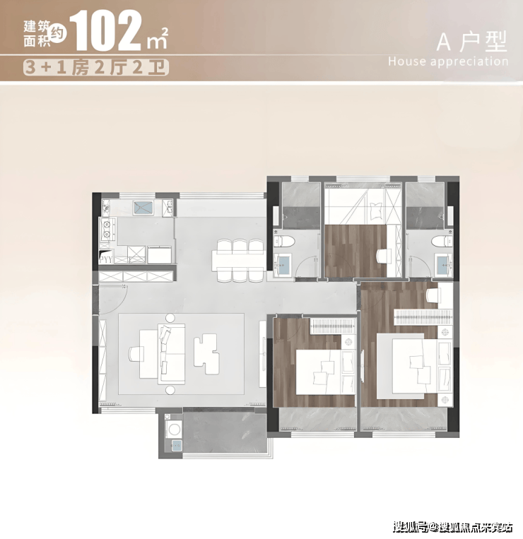 譬如建面约102㎡户型,有3+1房、4房两种交付选择,契合不同家庭居住需求。