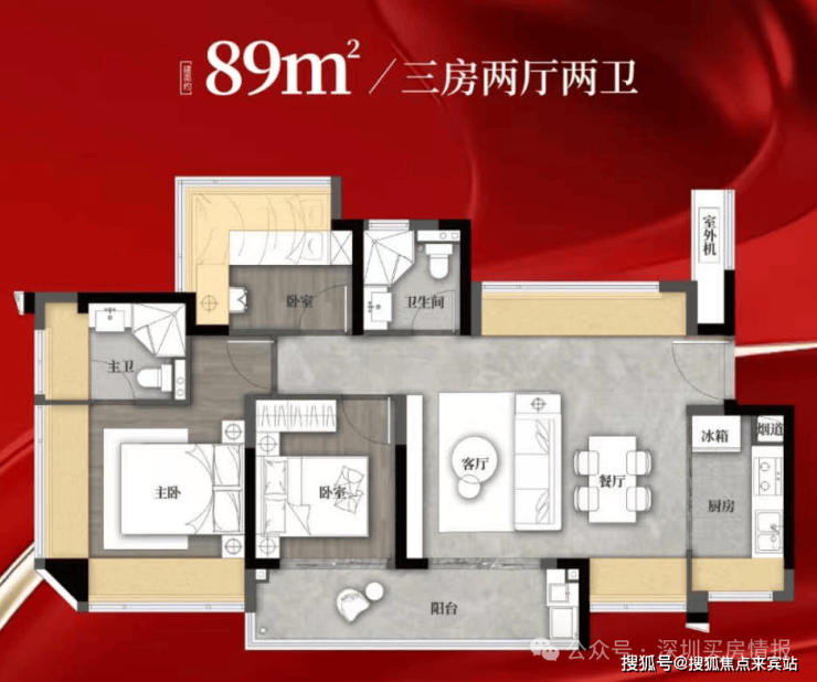 89㎡的3房2厅2卫,设计的是竖厅格局,客厅3.4米开间,LDKB一体化,S墙设计预留冰箱卡槽位,3个卧室分别做到了3.9米/2.9米/2.6米的宽度,客厅连接次卧出6.3米长的大阳台,L型厨房,卫生间干湿分离,有西北、西南或东南朝向。