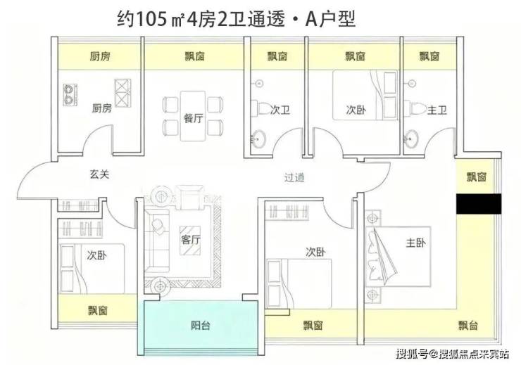 105㎡的4房2厅2卫,设计的是竖厅南北通透格局,餐客厅分离设计,四开间朝南,全屋十面飘窗,主卧270°无柱转角飘窗,U型厨房,卫生间干湿分离,得房率约100%(包含赠送),阳台东南朝向。