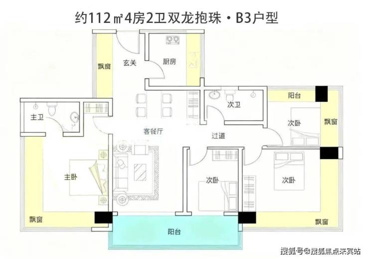 112㎡的4房2厅2卫(B3户型),设计的是竖厅双龙抱珠格局,进门独立入户玄关,餐客厅一体化设计,四开间朝南,全屋八面飘窗,主卧+1个次卧270°无柱转角飘窗,U型厨房,卫生间干湿分离,得房率约100%(包含赠送),客厅连接次卧出大阳台西南朝向。