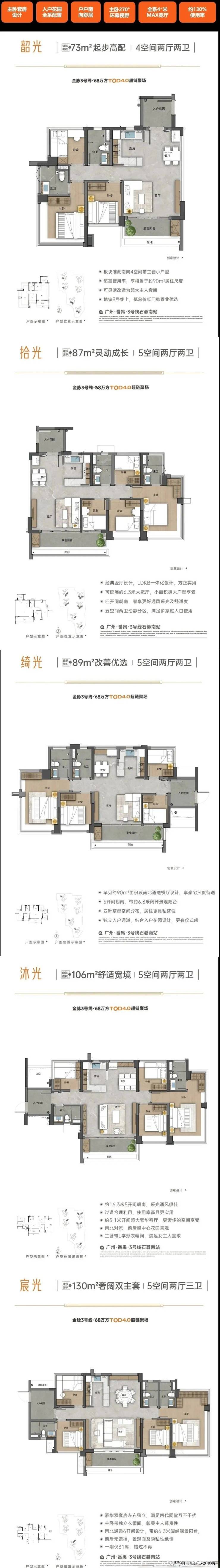 主力户型为建面73m²、87-89m²、109m²、130㎡的四到五房,刚需刚改都能上车