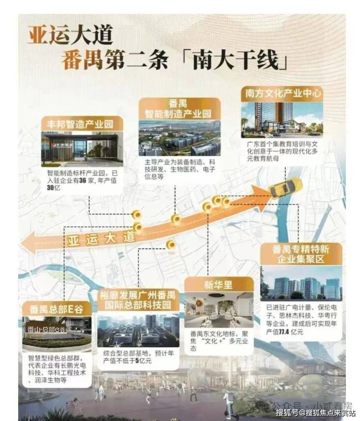 值得注意的是,以番禺广场商圈为起点,连通到莲花湾汽车产业带,“第二条南大干线”千亿产业轴已在酝酿。亚运大道沿线,密布番禺总部E谷、智能制造产业园、丰邦智造产业园等节点,这里将是番禺的“智核”所在,也是番禺未来所在。