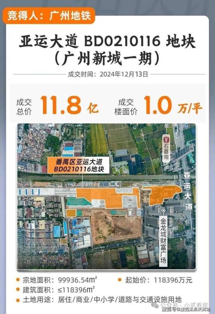 去年12月,广州新城停车场一期地块(亚运大道BD0210116地块)被广州地铁地产以底价118396万元拿下,楼面价约为1万/平(未扣除配建)。