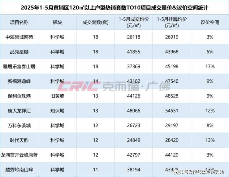 在价格上,克而瑞数据监测显示,今年1-5月黄埔区120㎡以上二手房成交均价32578元/㎡,较去年同时期下跌6%。