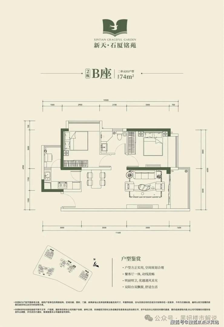 2栋B座二单元04、05户型:面积约为72-74㎡的2房2厅1卫。