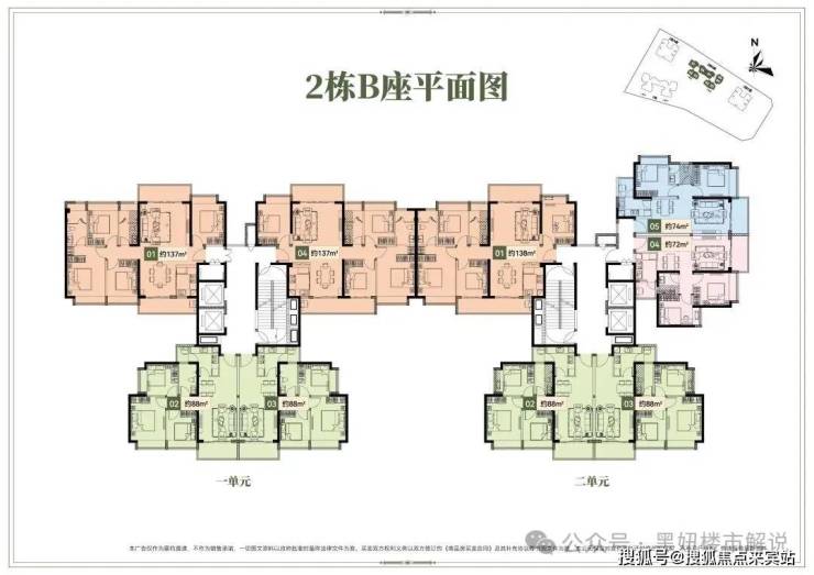 2栋B座一单元01、04户型、2栋B座二单元01户型:面积约为137-138㎡的4房2厅2卫;