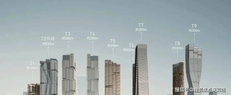 建筑体量与布局:规划9栋超高层建筑,涵盖酒店、公寓、超甲办公等多元业态,其中T7栋(办公+酒店)海拔高度325米(实际可建314.5米),刷新前海天际线;T3/T4栋为双子塔超甲级写字楼,高度约280-290.95米,外立面采用流线型幕墙设计,彰显地标气质。