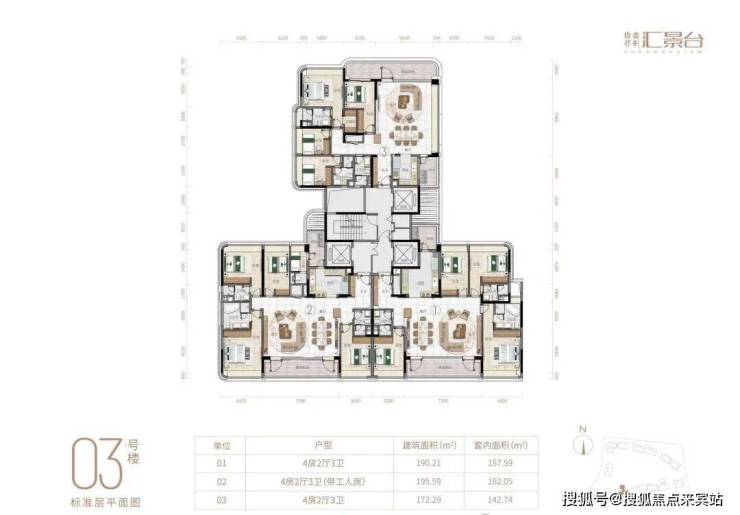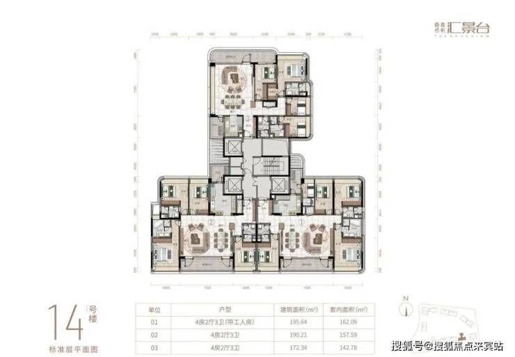 项目由14栋12层小高层组成,产品涵盖123-352㎡三至五房,共8类户型,户型实用率约82-84%