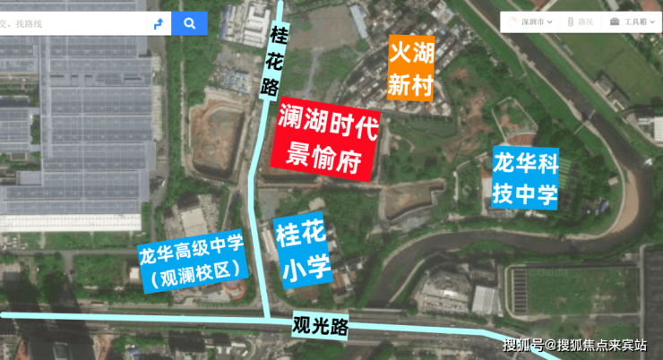 「澜湖时代景愉府」项目前身是观澜蚌岭旧改,位于龙华区观澜街道桂花路与观光路交汇处北侧约200米,南侧紧挨着桂花小学,东北侧是火湖新村,东侧是观澜湖,周边整体以工业园区为主,最近的地铁是正在动工的 22号线 “桂花站”。