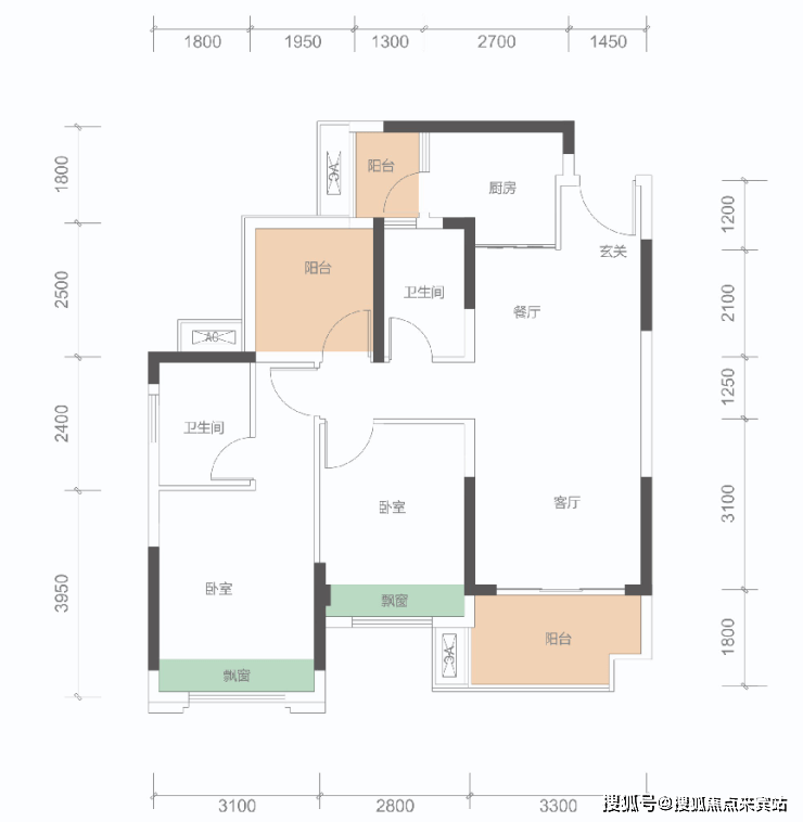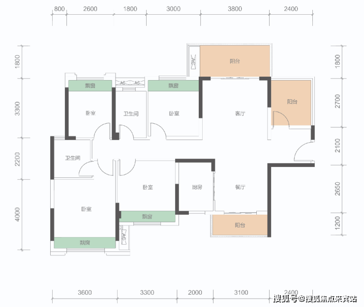 B户型: 100㎡(3+1房,2卫)同级面积稀缺3+1房、稀缺三开间朝南,总价约108万。
