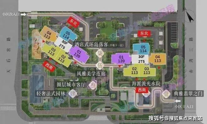 项目用地面积13657.28㎡,容积率仅2.8,建筑面积38155㎡,含住宅34555㎡,其他面积用于物业用房、托育机构和公交站,总户数290户,车位380个。共2栋30层高住宅组成,项目仅规划2栋31层住宅,共290套房源。这种“小而精”的布局,避免了超大型社区常见的嘈杂与拥挤,为业主创造了更为私密和专属的居住体验。社区内还规划了泳池、健身房、私宴厅等高端配套,两栋建筑之间通过风雨连廊衔接,细微之处尽显对生活便利性的考量。