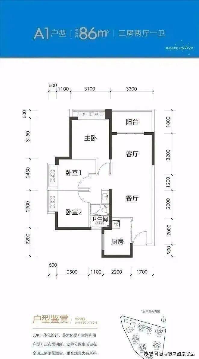 建面约86㎡3房2厅1卫户型,标准大三房的格局,经典的竖厅设计,非常适合首置的购房者,整个空间兼具实用性与舒适性。