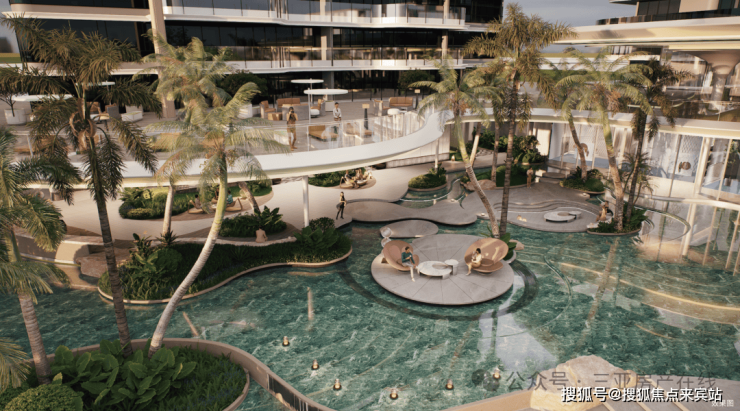 邱德光设计岛心多维共享空间,如社区“灯塔”,以蔚蓝泳池为视觉心脏,用拱廊构建地中海式或南洋风情社交氛围,涵盖恒温泳池、宴会厅、雪茄室、瑜伽室、咖啡厅、茶室等塔尖社交场域。