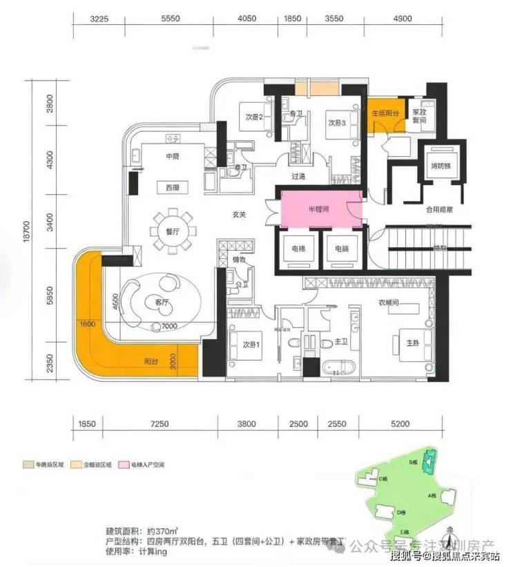 1B栋 370㎡:层峰之选,5梯2户,4房3厅4卫,双动线设计,兼顾家族居住与顶级社交。