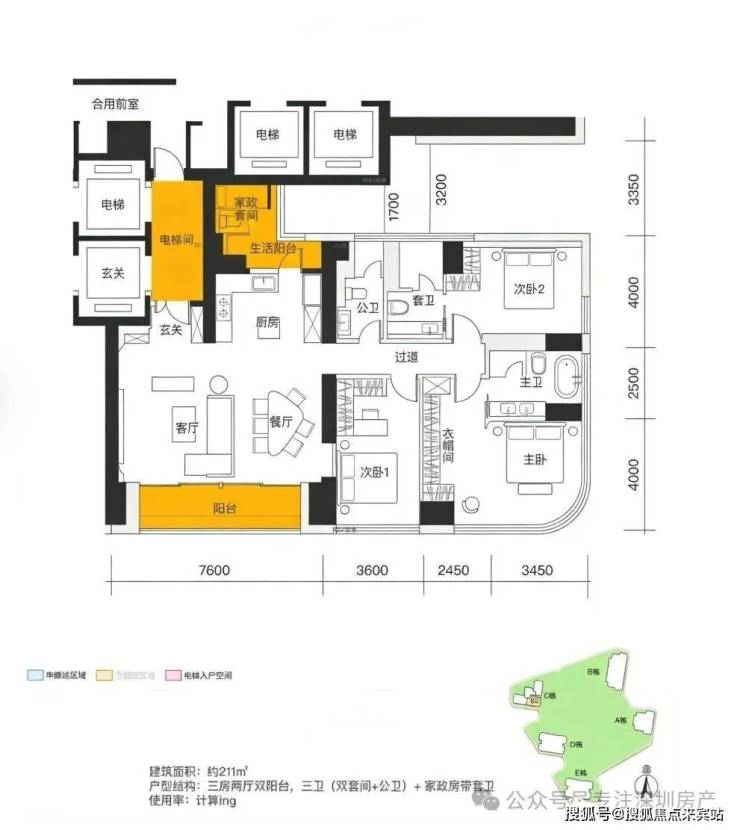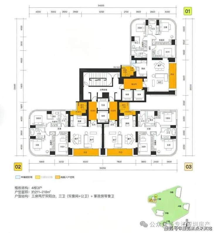 1C栋(1栋三单元)-51层:4梯3户,约210㎡,为一期的入门级户型,一层三户。