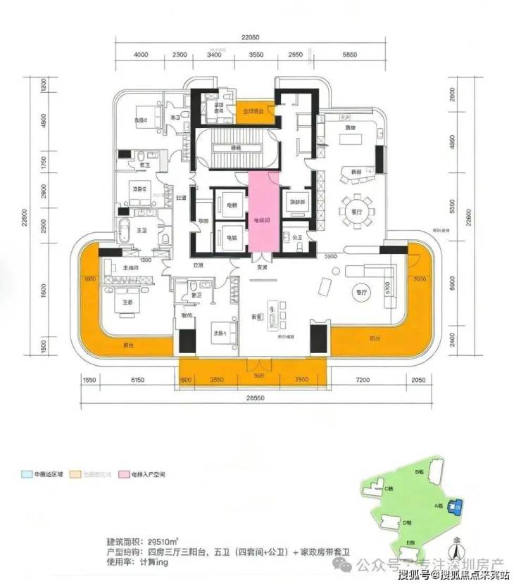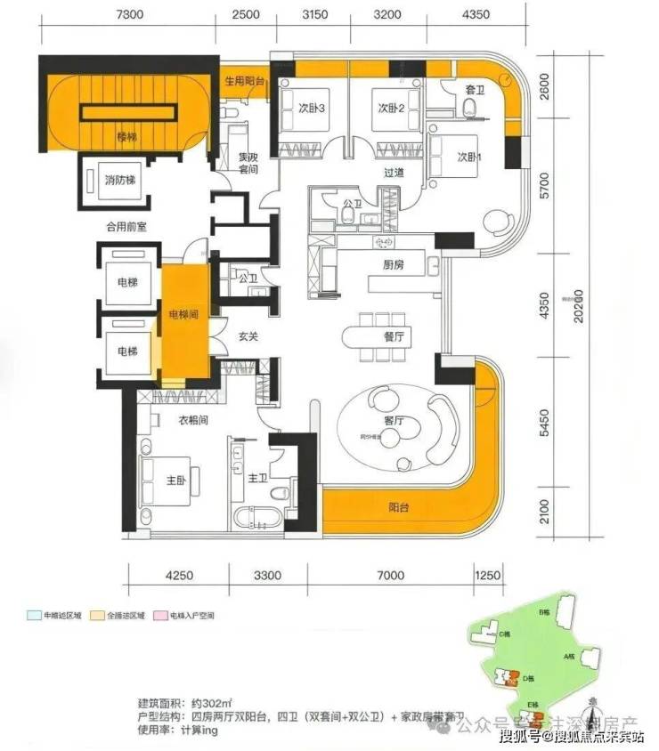 1E栋(1栋五单元)-43层:均为3梯2户,约305㎡,一层两户。