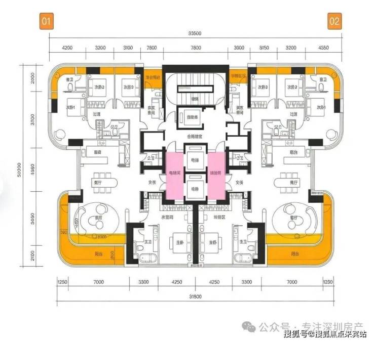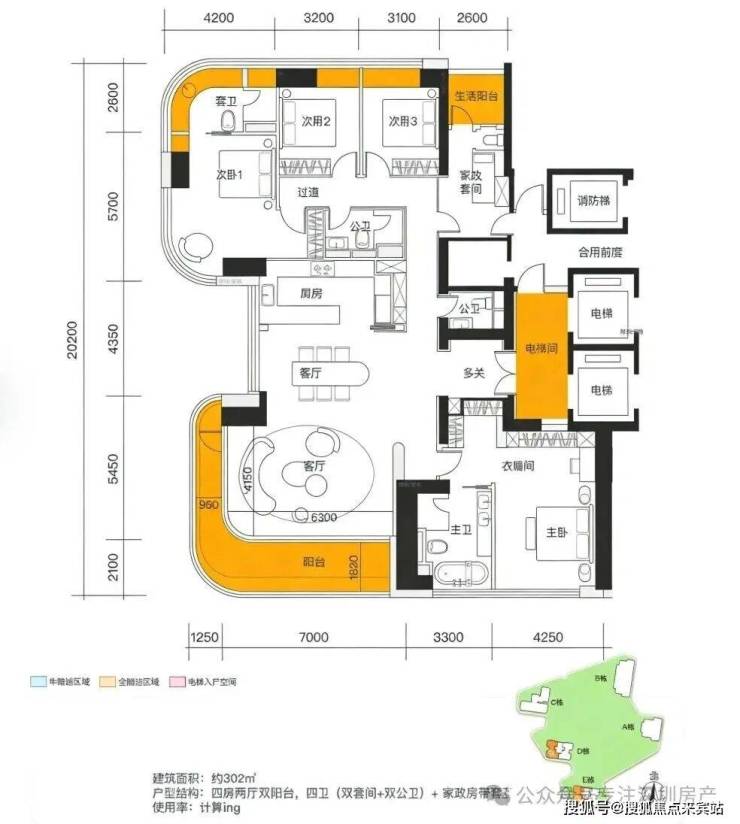 1D栋(1栋四单元)-45层:均为3梯2户,约305㎡,一层两户。