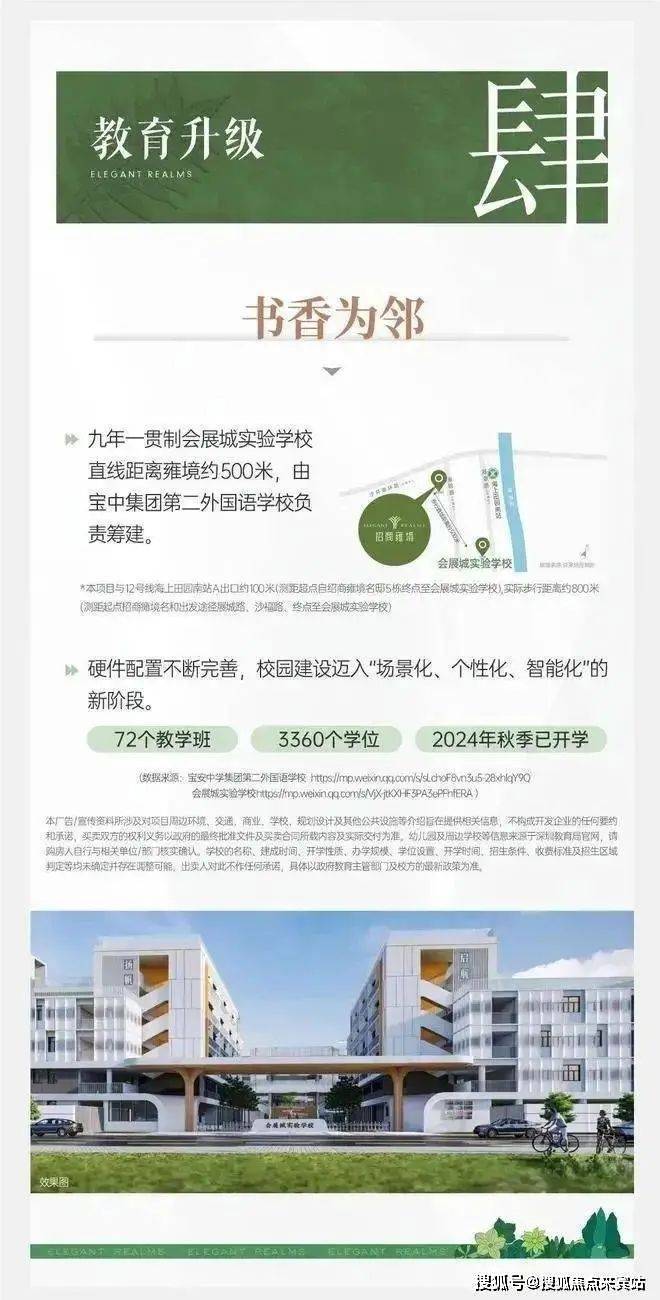 项目自带有1所9班制幼儿园,南侧约400米有会展湾实验学校,九年一贯制,72个班,3360个学位,由宝安中学(集团)第二外国语学校打造,去年9月份首次招生(小一录取积分96.8分,初一录取积分89.2分)。
