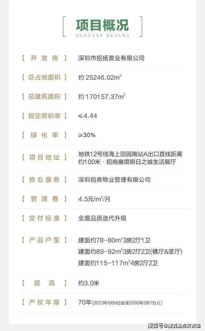 招商会展湾雍境名邸,由招商集团打造,总占地面积约2.52万㎡,总建筑面积约16.95万㎡,计容建筑面积约11.76万㎡,容积率4.3,分2个地块开发,共由6栋总高26-31层高的住宅组成,其中1栋1单元公租房26F,1栋2单元自持租赁30F,1栋3单元/2栋住宅31F,3栋/5栋住宅32F,4栋是1所9班制幼儿园。