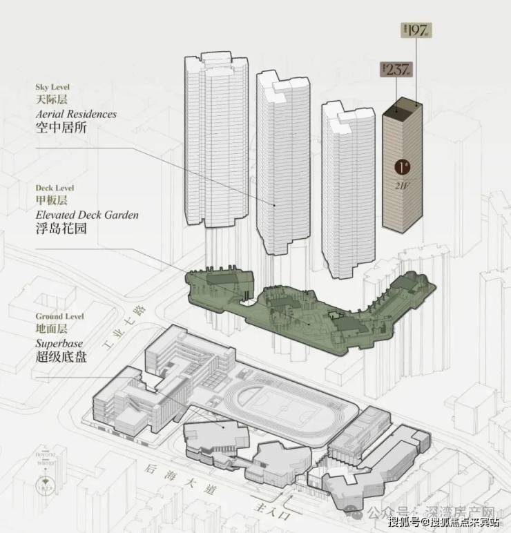 后海招商玺花园,住宅设计采用的”浮岛甲板“设计,四栋住宅落于甲板之上,独享甲板庭院花园。进而形成超级社区底盘 + 浮岛绿化甲板的垂直共生人居标杆。