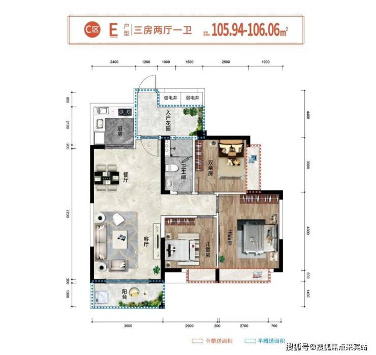 🏖𝐅户型约𝟭𝟬4㎡(三房两厅一卫)