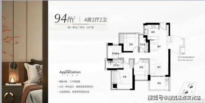 -94㎡的4房2厅2卫:设计的是竖厅格局,进门独立玄关,LDKB一体化,S墙设计预留冰箱卡槽位,主卧双飘窗设计,U型厨房,卫生间干湿分离,得房率约97%(包含赠送),东南朝向。