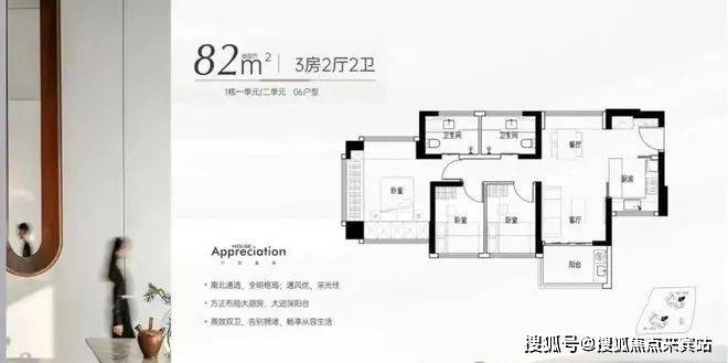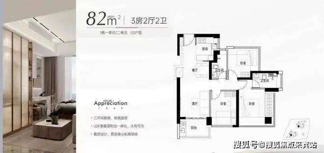 -82㎡的3房2厅2卫:06户型,设计的是竖厅南北通透格局,进门独立玄关,LDKB一体化,主卧270°飘窗设计,U型厨房,卫生间干湿分离,得房率约97%(包含赠送),阳台主朝西北向。