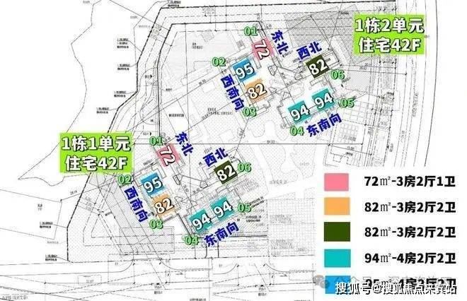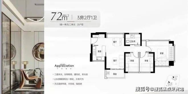 -72㎡的3房2厅1卫:设计的是竖厅南北通透格局,进门独立玄关,LDKB一体化,主卧270°飘窗设计,L型厨房,卫生间干湿分离,得房率约97%(包含赠送),阳台主朝东北向。