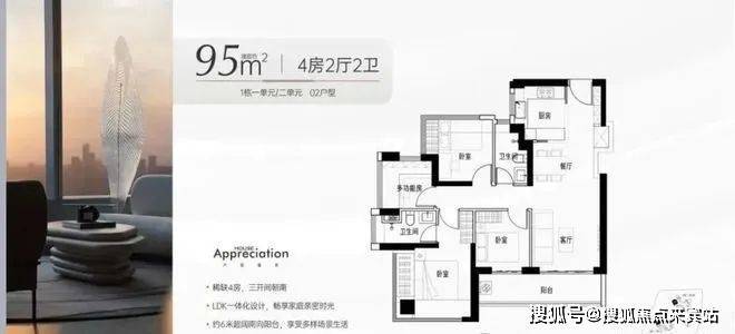 -95㎡的4房2厅2卫:设计的是竖厅格局,进门独立玄关,LDKB一体化,S墙设计预留冰箱卡槽位,主卧双飘窗设计,客厅连接次卧出6米长的大阳台,L型厨房,卫生间干湿分离,得房率约97%(包含赠送),西南朝向。