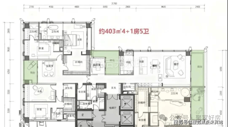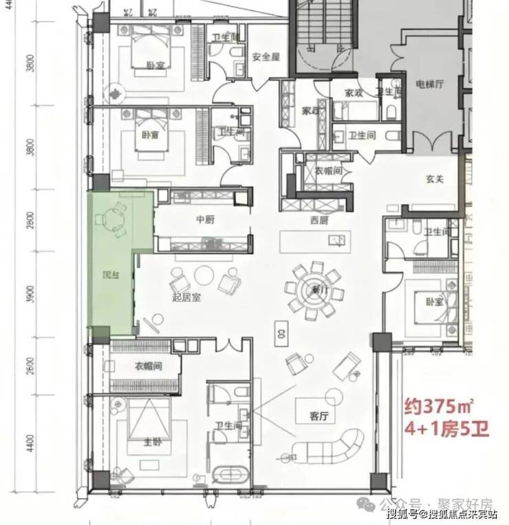 · 高区42F起(150-200米)是约370-375-403㎡4+1房五卫+家庭厅+家政套间;